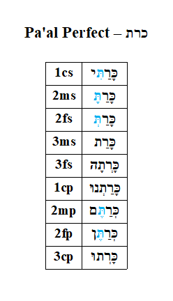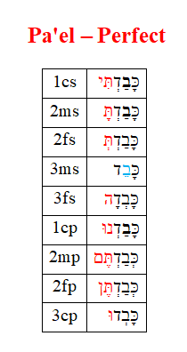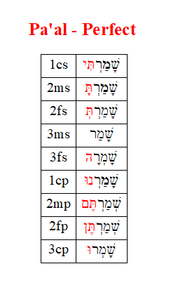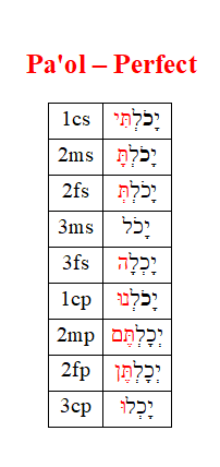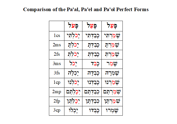 - Summary comparison – For a comparison of the perfect conjugations of pa'al, pa'el and pa'ol verbs, with the thematic vowel of each form colored in red, see here.