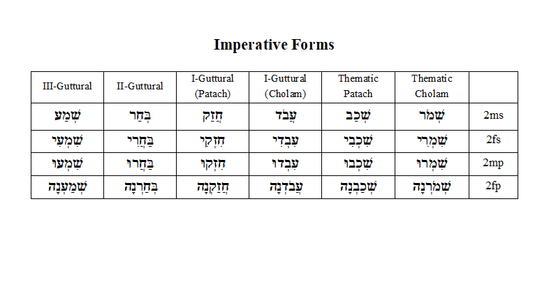 - Variant form – Sometimes one finds a variant elongated form of the masculine singular imperative, with a kamatz-heh ending. Cholam imperfects taking this form will have an initial kamatz katan as in: שָׁמְרָה or שׇׁפְטָה while patach imperfects will have an initial chirik as in: שִׁכְבָה or שִׁלְחָה.