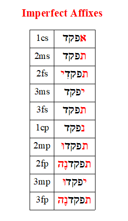 - The imperfect is also known as the "prefix conjugation" as it marks person, number and gender mainly by adding prefixes (the letters אית"ן) to the various verb stems, as seen here. [There are a handful of suffixes as well, but the hallmark of this conjugation that sets it apart morphologically from the perfect is the prefixes.] Though the consonants of these prefixes are somewhat fixed, the vocalization is not and will change depending on the binyan and root type.