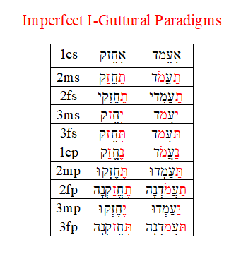 - They, too, fall into one of the two imperfect paradigms, with either a cholam or a patach under the second stem consonant (depending on whether they are dynamic or stative verbs). However, the vocalization of the prefix and the first root consonant (the guttural) differs from that of the standard imperfect pattern.