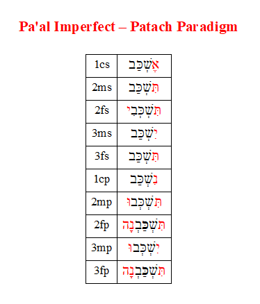 - Imperfect: Patach pattern – The second paradigm is marked by the patach taken by the second root consonant (יִשְׁכַּב); see the attached table.As gutturals tend to prefer patachs, it is not surprising that they take this pattern.