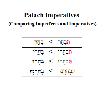 - Note that in the feminine singular and masculine plural forms, there are minor adjustments to the vocalization, with the "rule of sheva" being applied.As in these forms the removal of the imperfect prefix would otherwise cause there to be two consecutive shevas which Biblical Hebrew cannot tolerate, the initial sheva of the first root consonant is instead elongated to a chirik. [Thus, we have: "שִׁמְרִי" and not: "שְׁמְרִי".] When the second root letter is a guttural taking a chataf (as in: תִּבְחֲרִי), with the removal of the prefix the initial sheva turns instead into a patach to match the vowel of the chataf (בַּחֲרִי), as per the guttural version of the "rule of sheva".