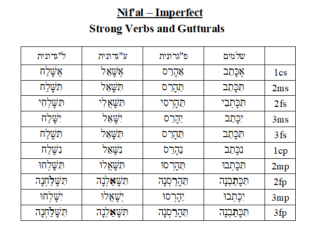 - The Paradigm – Click here for the imperfect conjugation pattern of strong verbs (including those with gutturals) in the nif'al. [Penultimate stress is marked in bold.]
