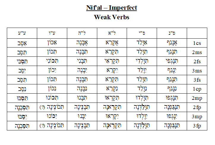 - The paradigm – Click here for the imperfect conjugation pattern of weak verbs in the nif'al. [Penultimate stress is marked in bold.]