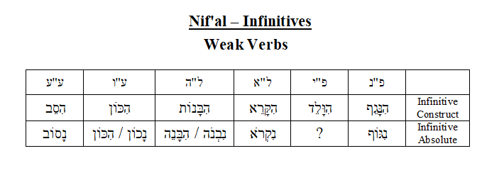 - Infinitive absolute – Not all classes of weak roots are attested to in the infinitive absolute, but, as with strong verbs, some weak verbs might also take two possible forms. One form builds off the perfect third person, masculine, singular but replaces the stem vowel with a cholam (נִגּוֹף). The other is built off the imperative (הִבָּנֵה). See here.