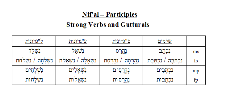 - Participles – The stem of nif'al participles is similar to that of the perfect form, differing only in the length of the stem vowel. While perfect forms take a patach, participles take a kamatz (נִכְתַּב > נִכְתָּב). Note also that there are two possible forms for the feminine singular (נִכְתָּבָה / נִכְתֶּבֶת). See a paradigm of the conjugation here.