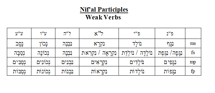 - Participles – As with strong verbs, the stems of weak nif'al participles are similar or identical to the stem of the third person, masculine singular perfect form. See a paradigm here and note slight variations in vocalization as below: